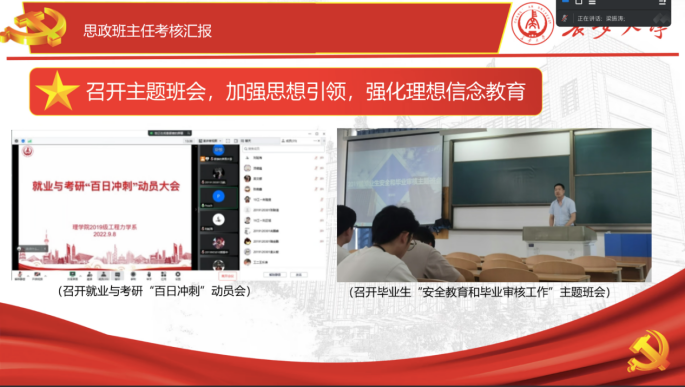 刘延海汇报了班主任和体育指导教师在学生思想政治教育、学业指导与学风教育、职业生涯规划与指导、困难学生帮扶、劳动教育组织和体育活动指导等方面所做的工作。梁振涛和王成结合“思政班主任”工作的核心内容,在理想信念教育、考研就业指导和帮扶学生困难等方面总结了本学年工作,进行了评优答辩。