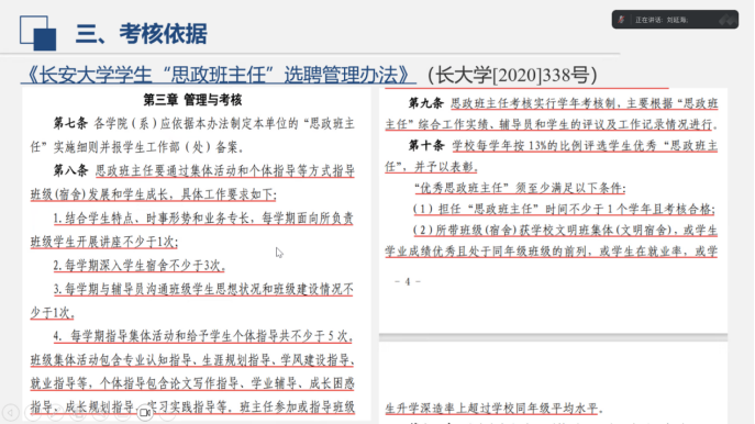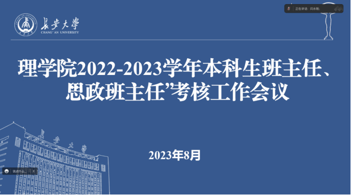 学院党委书记闫永刚对各位班主任、“思政班主任”和体育指导教师的辛勤付出表示了感谢,充分肯定了各位老师在“三全育人”工作中的重要作用,强调育人工作应聚焦主责主业,聚焦立德树人根本任务,争取在学生思想政治教育、学习科研和心理关怀等方面做出更大贡献。屈颖根据《365英国上市网站官网本科生班主任聘任管理办法》和《365英国上市网站官网学生“思政班主任”选聘管理办法》介绍了管理办法和考核要求。