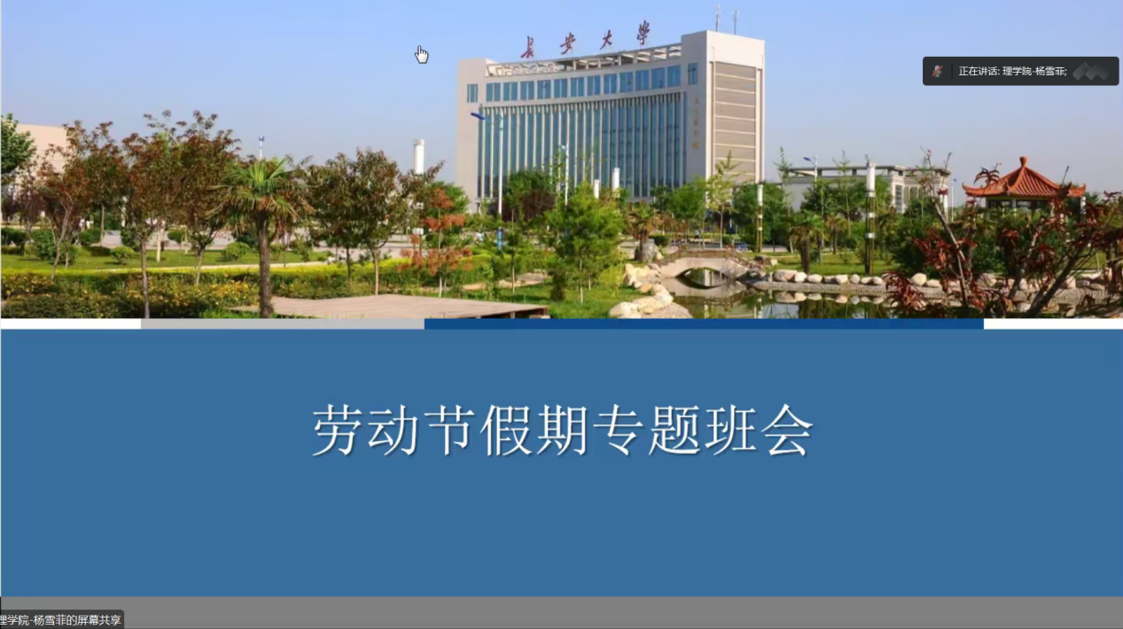 两名辅导员首先强调了安全问题,学生外出要严格履行请假登记手续,外出期间应保持与老师、同学和家人的联系,返校后及时向学院销假。叮嘱同学们假期出行选择有安全保障的交通工具,校内和校外住宿均注意消防安全、谨防财务被盗。同时保持身体健康,规律作息、健康饮食,树立每个人是自己健康第一责任人的理念,注意健康防护,有不适症状及时报告并就医。