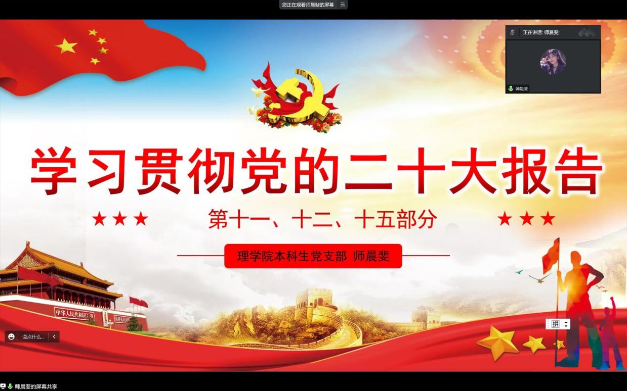 杨雪菲结合党的二十大报告要点,要求大家将理论学习与实践工作相结合,进一步提升理论学习效果。尤其要关注报告中习近平总书记对青年工作的重要论述,这段论述文字精炼、内涵丰富、寓意深刻,对指导学生党员的努力方向具有重要意义。谢起鹏、史天祯、邹欣圆、师晨斐和叶蓓五名党员将党的二十大报告中各部分内容的新观点、新论断、新思想进行了领学。